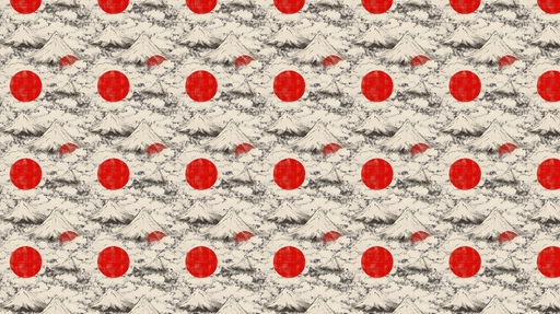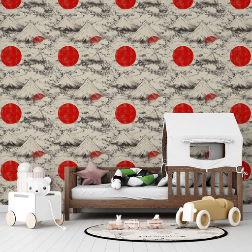 WonderMuralNosso belo papel de parede mural exibe um padrão harmonioso de montanhas japonesas cercadas por soles vermelhos e nuvens suaves, tudo em um fundo c...