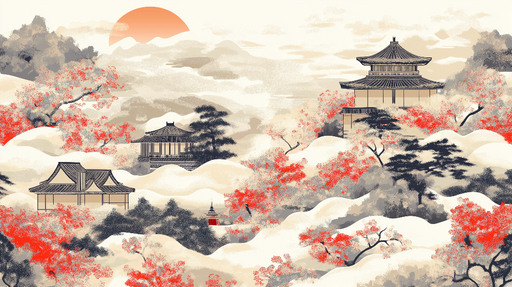 WonderMuralIlustração Japonesa ao Nascer do Sol Este papel de parede mural transporta você para uma encantadora paisagem japonesa, onde pavilhões tradicionais...