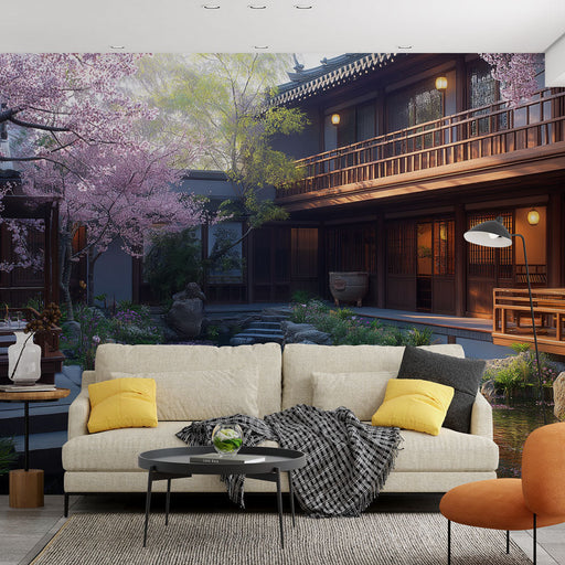 WonderMuralEste papel de parede mural evoca um jardim zen japonês, mostrando a harmonia entre a natureza e a arquitetura tradicional. As delicadas flores de c...