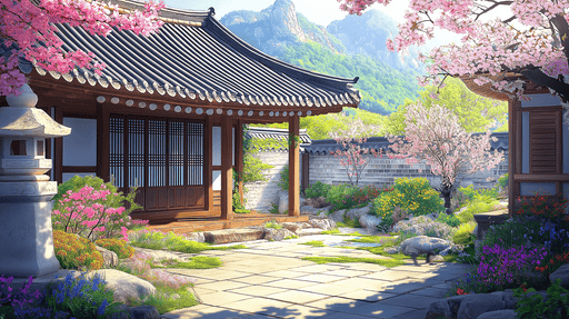 WonderMuralPapel de parede jardim zen | Uma paisagem japonesa calmante com flores e montanhas