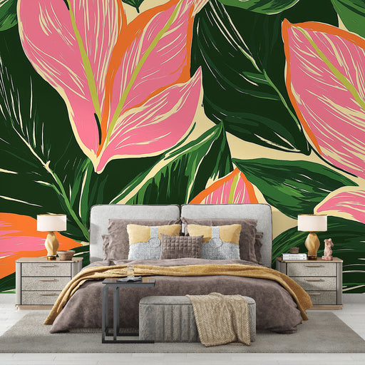 WonderMuralEste vibrante papel de parede mural apresenta um marcante design botânico, misturando folhas verdes escuras com acentos de rosa e laranja. As forma...