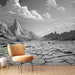 Descubra nosso papel de parede mural que retrata uma cativante paisagem árida, imersa em tons de preto e branco. As majestosas montanhas destacam formações rochosas acidentadas, enquanto o chão rachado testemunha a secura desta extensão desértica. Os delicados detalhes das nuvens adicionam uma dimensão aérea a esta cena impressionante.