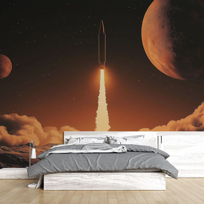 Este cativante papel de parede apresenta um foguete majestoso em plena ascensão, iluminado por chamas laranja brilhantes, destacando-se contra um fundo surreal composto por planetas e nuvens finas. Com uma paleta de cores quentes, variando de vermelho a laranja e preto, evoca uma sensação de aventura e mistério pelo universo.