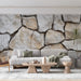 Este papel de parede mural evoca a beleza de uma parede de pedra natural, com tons claros e texturas ricas que dão caráter aos seus interiores. As pedras são dispostas de forma irregular, criando uma sensação de profundidade e autenticidade.