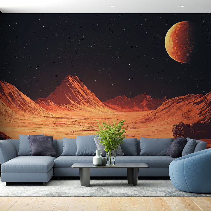 Descubra nosso Papel de parede com um fascinante paisagem marciana, onde os tons quentes de laranja e vermelho harmonizam-se com um céu estrelado. As montanhas desérticas criam um cenário majestoso, convidando à contemplação e fuga para outros mundos.