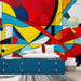 Acest tapet mural prezintă o compoziție geometrică îndrăzneață cu forme abstracte și culori vibrante. Liniile dinamice și blocurile de culori vii, precum roșu, galben, albastru și negru, creează un efect vizual captivant care atrage imediat privirea.