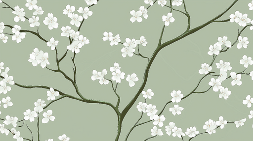 WonderMuralAceastă tapet shabby chic evidențiază un model fermecător de flori albe în plină floare, împodobite cu ramuri delicate pe un fundal verde liniștito...