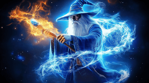 WonderMuralAceastă captivantă tapetă prezintă un vrăjitor măreț mânuind un baston magic fluid, înconjurat de explozii de flăcări și energii albastre. Imaginea...
