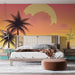 Această tapet elegantă prezintă un apus de soare magnific în nuanțe pastelate, unde palmierii se profilează pe un fundal viu colorat. Gradientele de roz, portocaliu și galben creează o atmosferă relaxantă și tropicală, transformând orice spațiu într-un refugiu inspirat de natură și pace.