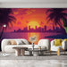 Această tapet captivantă prezintă un apus de soare spectaculos peste un oraș modern, unde palmierii se află în prim-plan, creând o atmosferă tropicală și relaxantă. Nuantele flamboyante de roz, portocaliu și violet luminează cerul, în timp ce reflexia soarelui pe apă adaugă o notă de magie scenei nocturne.