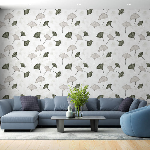 WonderMuralAcest tapet evidențiază un model frumos de frunze de ginkgo, variind în nuanțe de verde și gri, evocând liniște și natură. Fundalul alb strălucitor...