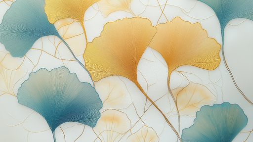 WonderMuralAceastă tapet mural magnific prezintă un model delicat de frunze de ginkgo, cu nuanțe aurii și acvatice. Frunzele desenate fin aduc o notă de elega...