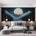 Acest tapet mural captivant evocă o scenă magică de noapte, cu o lună strălucitoare care veghează asupra unui lac senin, înconjurat de munți măreți și o pădure de brazi. Nuanțele de albastru și roz creează o atmosferă moale și visătoare, perfectă pentru o ambianță relaxantă.