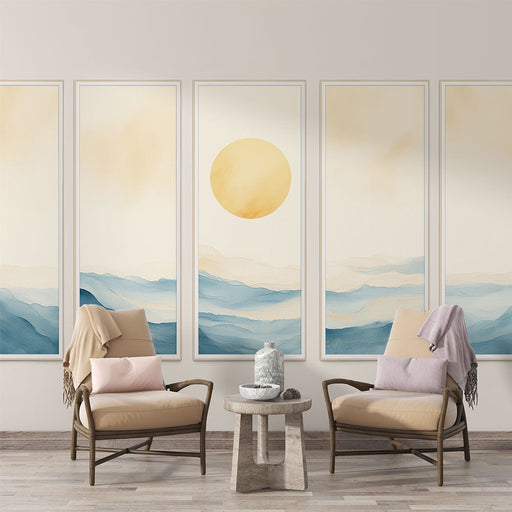 WonderMuralAcest tapet mural oferă un peisaj muntos magnific pictat în acuarelă, cu nuanțe de albastru și un soare mare care iluminează scena. Nuanțele moi cr...
