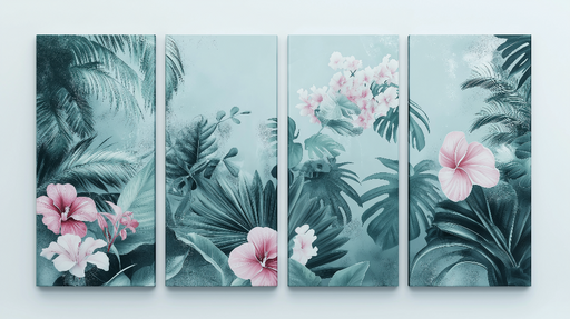 WonderMuralTapetul nostru exclusiv prezintă un elegant motiv tropical, cu nuanțe relaxante de albastru și delicate flori roz. Frunzele luxuriante și florile d...