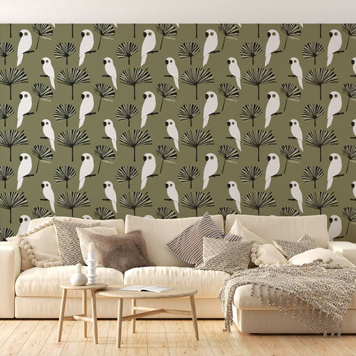 WonderMuralTapetul nostru frumos exclusiv prezintă un model jucaus de păsări albe așezate pe tulpini de palmier, toate pe un fundal de măslin reconfortant. Co...