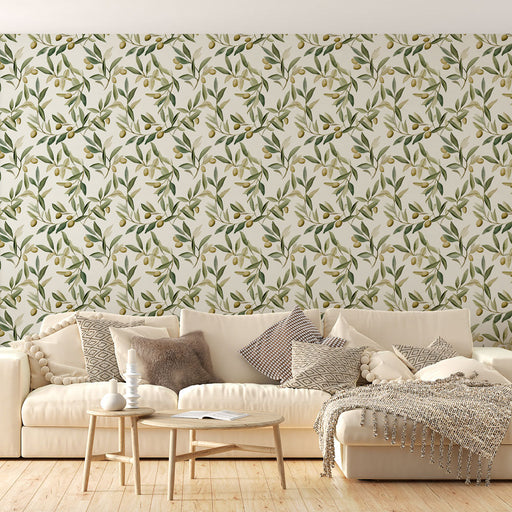 WonderMuralAceastă tapetă prezintă un model luxuriant de ramuri de măslin, evidențiind măsline verzi cu reflecții subtile. Frunzele delicate și fundalul moale...
