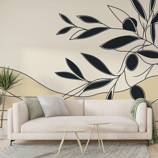 WonderMuralAcest elegant tapet mural prezintă un design minimalist cu ramuri delicate de măslin în negru pe un fundal crem. Liniile ondulate suprapuse în bej ...