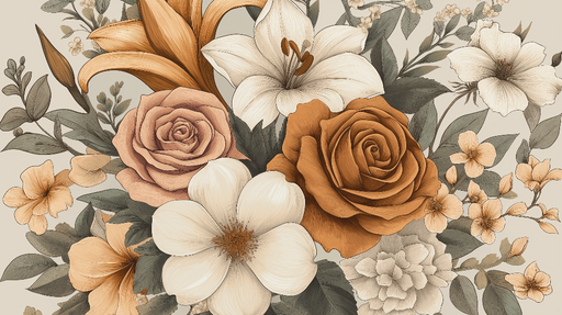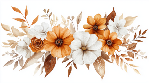 WonderMuralAceastă tapet elegantă prezintă un set de flori în nuanțe de toamnă, cu petale delicate în nuanțe de alb, portocaliu și maro pământiu. Frunzele fin...