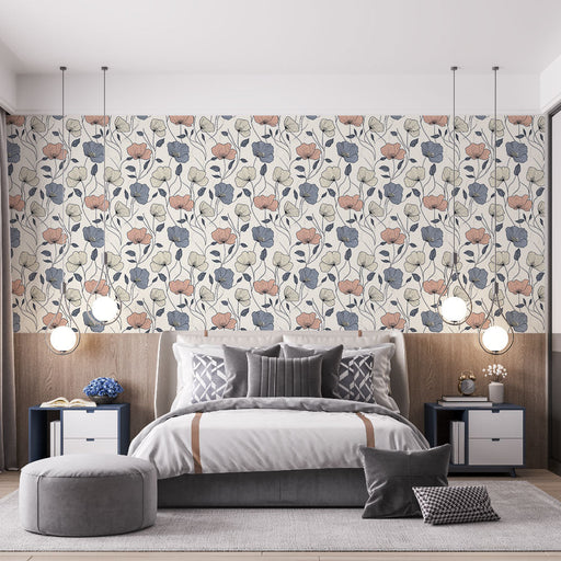 WonderMuralAcest tapet mural floral prezintă un model delicat repetitiv de flori în tonuri moi, amestecând nuanțe de roz, bej și gri pe un fundal crem relaxan...