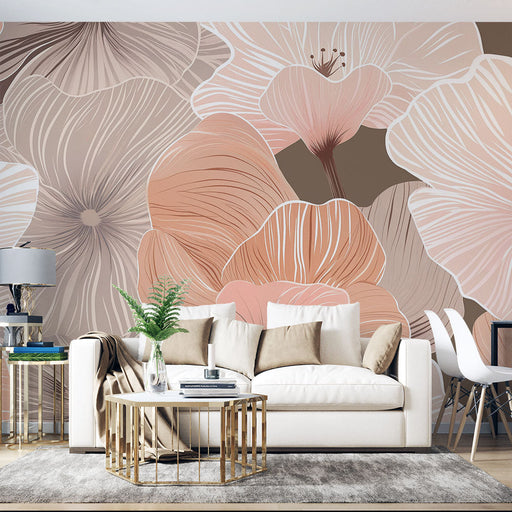 WonderMuralAcest tapet mural fermecător prezintă un model de flori pastelate în tonuri moi de portocaliu, bej și negru, oferind o ambianță caldă și primitoare...