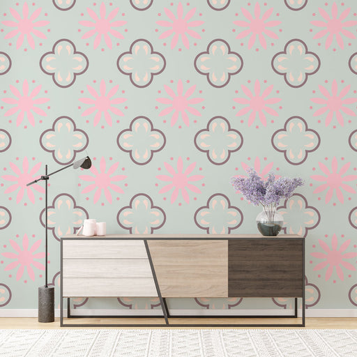WonderMuralAcest tapet mural floral prezintă un model frumos de flori stilizate într-o paletă delicată de rozuri, albastru și crem, aducând un strop de prospe...