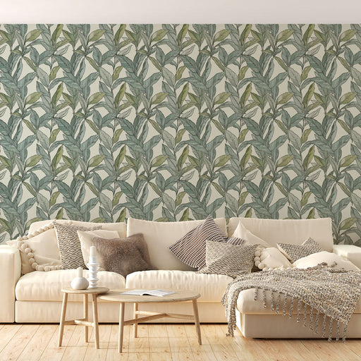 Vezi detalii completeTapet cu frunziș delicat | Model rafinat de frunze verzi și albastre pe un fundal deschis