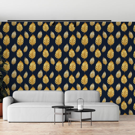 WonderMuralTapetul nostru mural prezintă un model fermecător de frunze aurii desenate delicat, ieșind în evidență pe un fundal albastru închis. Acest design s...