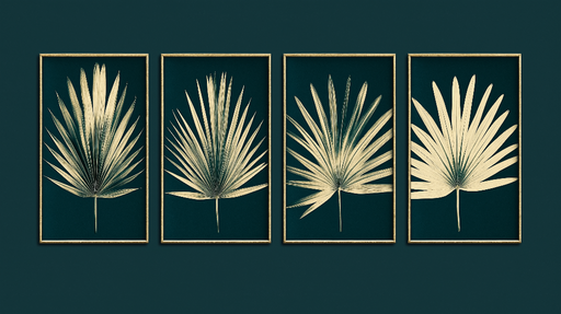 WonderMuralTapetul nostru evidențiază un set de patru frunze de palmier aurii, elegant încadrate, fiecare prindând viață pe un fundal albastru intens. Contras...
