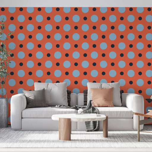Studio SamaAdoptă un stil retro cu tapetul nostru mural cu buline care prezintă un model de puncte mari albastre și puncte mici negre pe un fundal portocaliu ...