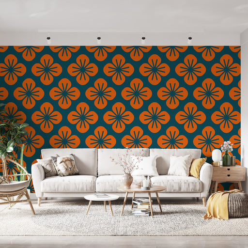 Studio SamaAdaugă un strop de dinamism interiorului tău cu tapetul floral cu modele geometrice portocalii pe un fundal albastru închis. Acest design îndrăzneț...