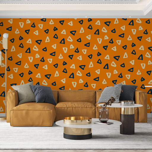 Studio SamaAdaugă o notă de grafică îndrăzneață interiorului tău cu modelele geometrice de tapet mural care prezintă triunghiuri abstracte pe un fundal portoc...