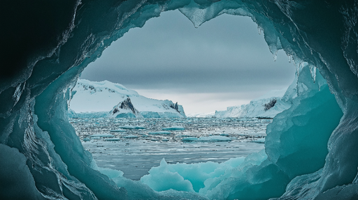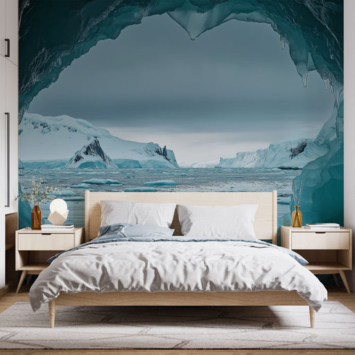 WonderMuralAceastă tapet mural oferă o priveliște uluitoare printr-o cavitate înghețată, dezvăluind un peisaj de gheață albăstruie și formațiuni montane înzăp...