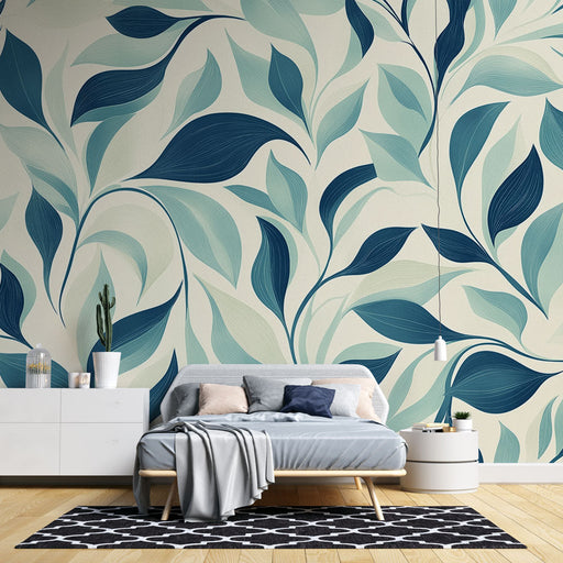 WonderMuralAceastă tapetă prezintă un model magnific de frunze stilizate în nuanțe de albastru, variind de la deschis la închis, creând o atmosferă atât liniș...