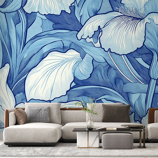 WonderMuralAceasta tapet mural prezintă un design floral modern, cu flori stilizate mari în nuanțe de albastru intens și deschis, completate de detalii delica...