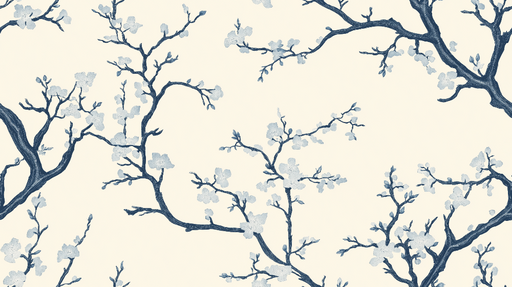 WonderMuralAceastă tapet shabby chic evidențiază un model delicat de ramuri înflorite, în nuanțe de albastru, pe un fundal de crem liniștitor. Detaliile flori...