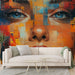 Această tapetă artistică prezintă un chip stilizat captivant, compus din blocuri de culoare vibrante și texturi bogate. Nuanțele de albastru, portocaliu și roșu se împletesc pentru a crea o atmosferă care este atât dinamică, cât și intrigantă. Acest design este perfect pentru a aduce o notă de originalitate și energie în orice cameră.