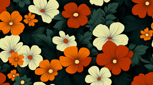 WonderMuralDescoperiți tapetul nostru uimitor cu un model floral colorat, cu flori stilizate în nuanțe vibrante de portocaliu, roz și crem, îmbogățit cu frunz...