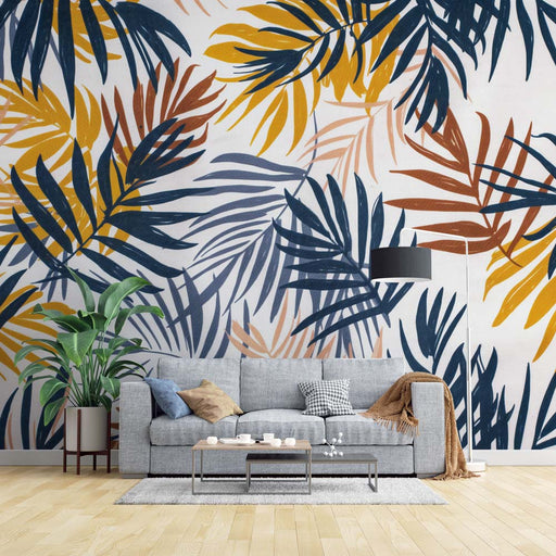 WonderMuralAceastă tapet mural prezintă un design îndrăzneț cu frunze tropicale multicolore. Frunzele vin în nuanțe de albastru marin, muștar, ruginiu și pier...