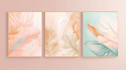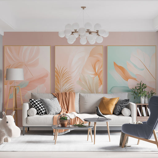 WonderMuralAcest tapet mural frumos este o asamblare de trei panouri cu modele delicate de frunze în nuanțe pastelate. Tonalitățile de roz, piersic și verde d...