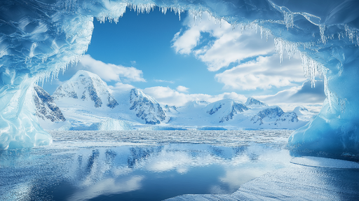 WonderMuralAceastă tapet mural prezintă o deschidere magnifică a unei peșteri de gheață către un peisaj uluitor de munți înzăpeziți și ceruri azurii. Nuanțele...
