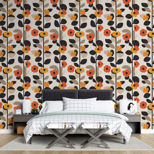 WonderMuralAcest tapet mural fermecător prezintă un model jucăuș de flori stilizate în nuanțe vibrante de portocaliu și albastru, pe un fundal crem moale. Flo...