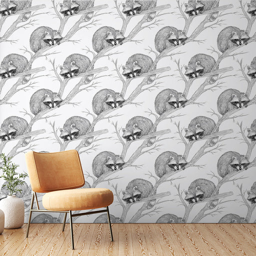 WonderMuralAcest tapet prezintă un model adorabil de ratoni așezați în mod pașnic pe ramuri, ilustrat într-un stil grafic care atrage atenția. Nuanțele de alb...
