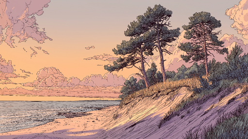 WonderMuralAcest tapet mural evocă o scenă liniștitoare de coastă, ilustrând o plajă la apus înconjurată de copaci măreți. Culorile pastelate ale cerului, var...