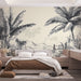Tapetul nostru prezintă o ilustrație detaliată a unei jungle tropicale, creată în tonuri monocrome pentru o abordare elegantă și contemporană. Frunzele mari de palmier și bananier ies în evidență frumos, în timp ce munții din fundal adaugă adâncime acestei scene naturale.