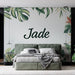 Descoperă tapetul nostru inspirat de natură, având numele Jade înconjurat de frunze tropicale magnifice și flori colorate. Acest design revigorant și dinamic este ideal pentru a adăuga o notă de exotism în decorul camerei unui copil.