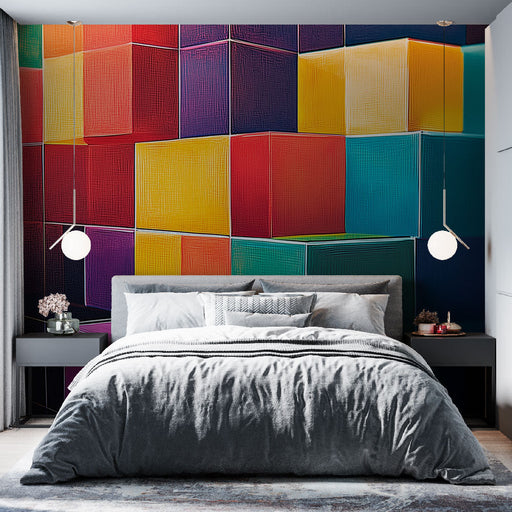 WonderMuralAceastă tapet captivantă prezintă un design geometric plin de blocuri colorate în nuanțe strălucitoare, variind de la roșu la galben și incluzând a...
