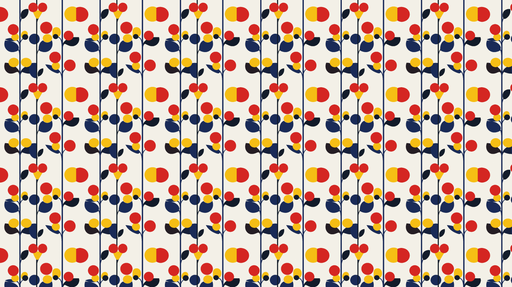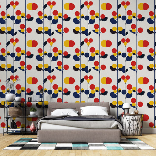 WonderMuralAcest tapet prezintă un model vibrant de flori stilizate și forme geometrice, combinând nuanțe de roșu, galben și albastru pe un fundal deschis. El...