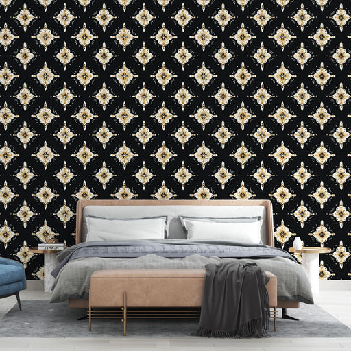WonderMuralTapetul nostru mural exclusiv prezintă un design distinctiv al modelelor florale geometrice în aur, subtil contrastat de un fundal negru adânc. Fie...