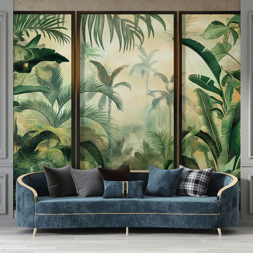 Vezi detalii completeImitație de pictură tapet mural junglă | Evadare tropicală cu lumină aurie